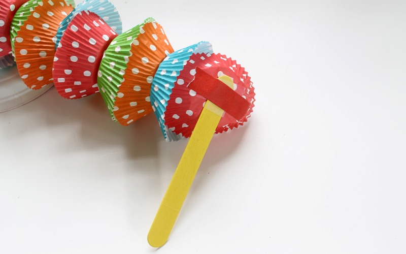 Tape another craft stick to the back of the plate tied to the cupcake liners. Then, secure this plate to the back of the head using glue and/or tape.