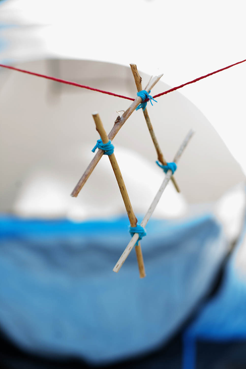 Cut or break the sticks into equal sizes (or sizes you want to work with) and start tying the joints together with pieces of string.