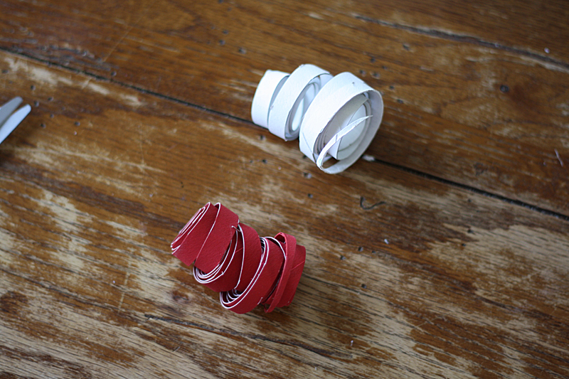 Paint one of the cardboard tubes, inside and out with red paint. Paint the other, inside and out, with white paint. Allow the tubes to dry for about 30-40 minutes. They will be dry to the touch, but will still feel pliable and damp.