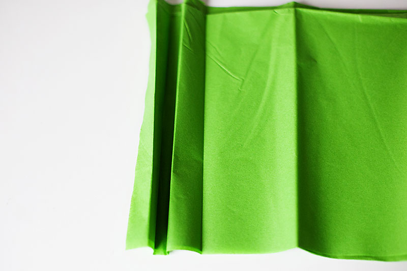 Tissue flowers are easy and fun. Start with 6 or 7 pieces of tissue paper. This one is cut to about 6″ x 12″. Accordion fold the paper starting from the short end.