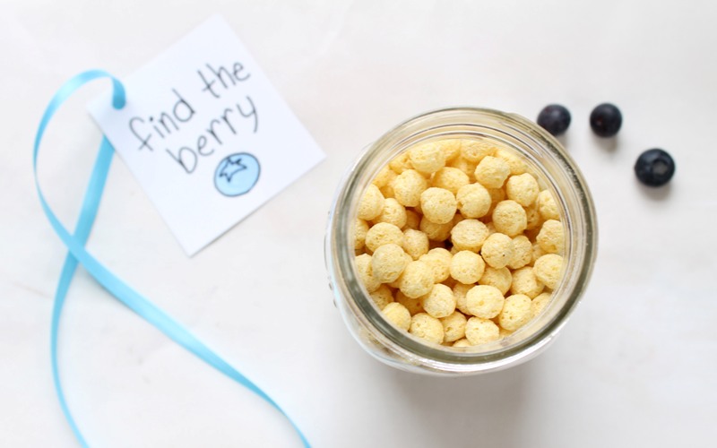 A blueberry, a strawberry, a dried apricot, a Berry Kix, a pretzel, a goldfish cracker… Hide just one piece of any snack you like in a mason jar full of Kix, leave a bit of space at the top for shuffling, close tightly with a lid and challenge kids to find what’s hiding inside. Gently roll the mason jar around until the hidden morsel shows itself.
