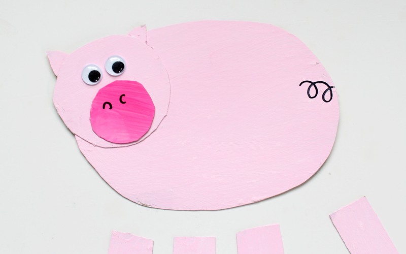 Glue googly eyes to the head and draw two lines on the snout with the marker. Draw a curly tail with the marker.